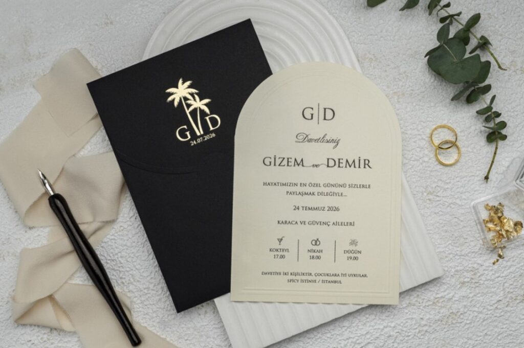 Bu davetiye, özellikle lüks sahil düğünleri, “beach wedding” konseptli törenler veya modern şehir organizasyonları için eşsiz bir seçimdir. Kağıt üzerindeki gofre (kabartma) çerçeve detayı, dokunulduğunda hissedilen kaliteyi görsel bir şölenle tamamlıyor. Profesyonel bir titizlikle hazırlanan bu tasarım, misafirlerinizin o geceye dair heyecanını en üst seviyeye taşımak için her detayıyla özel olarak kurgulandı.