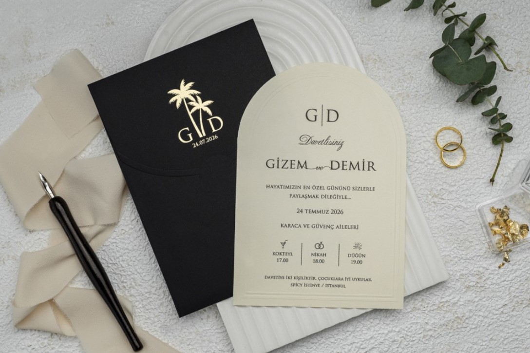 Modern bir yaz düğününün enerjisini, siyahın asaletini ve altının ışıltısını bir araya getiren bu özel tasarım, ezber bozan bir şıklık arayan çiftler için hazırlandı. Gizem ve Demir çiftinin bu unutulmaz gecesine eşlik eden model, mimari hatları egzotik detaylarla buluşturarak misafirlerinize lüks bir sahil kutlamasının habercisi oluyor.